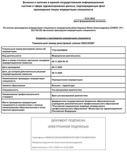 2024 г.- Повышение квалификации Институт профессионального образования ФГБОУ ВО ОрГМУ, г.Оренбург (УЗИ).